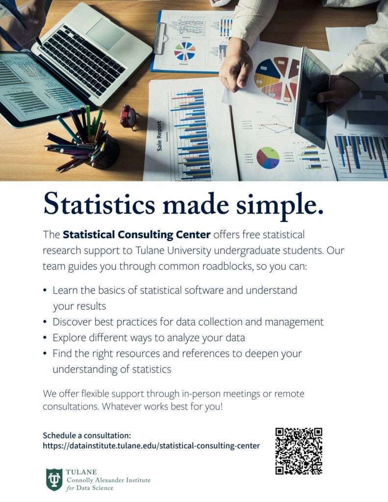Schedule a consultation here: https://datainstitute.tulane.edu/statistical-consulting-center