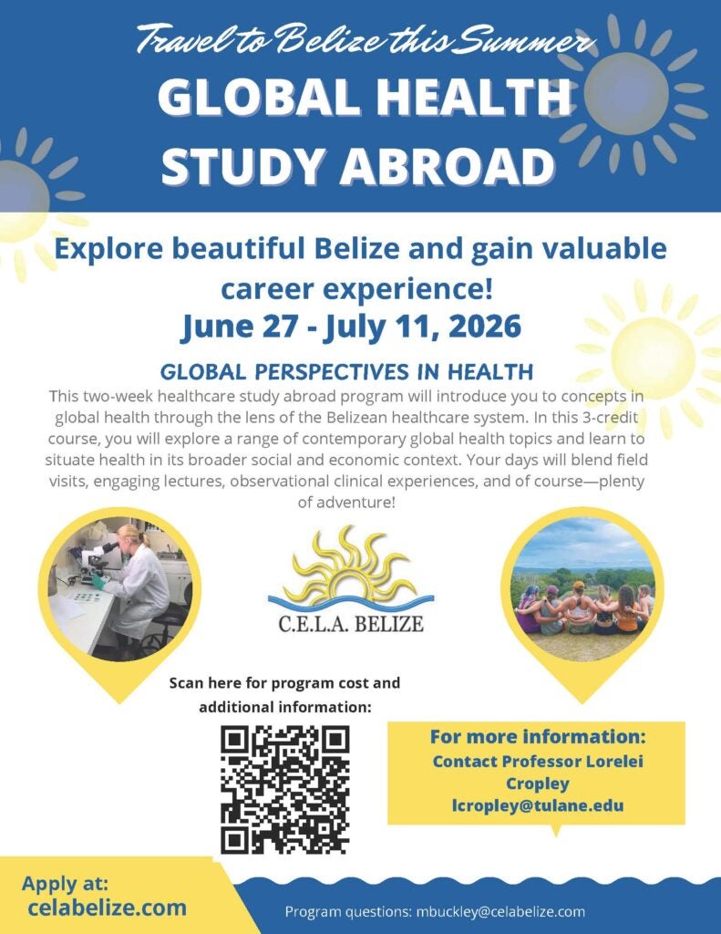 The summer course “Global Perspectives in Health” in Belize is scheduled for June 27 – July 11, 2026. Dr. Cropley will be teaching it, as well as guest lectures from Belizean and global leaders from PAHO, UNICEF, Ministry of Health, Caribbean Community Climate Change Centre, Indigenous studies scholars, and more. Email Dr. Cropley for more information: lcropley@tulane.edu.