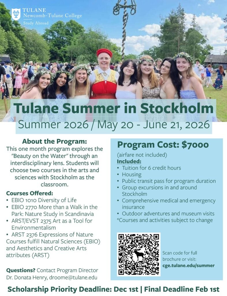 Program cost includes tuition, hosing, excursions, and more. Contact the faculty director with questions: Faculty Director – Dr. Donata Henry (droome@tulane.edu)