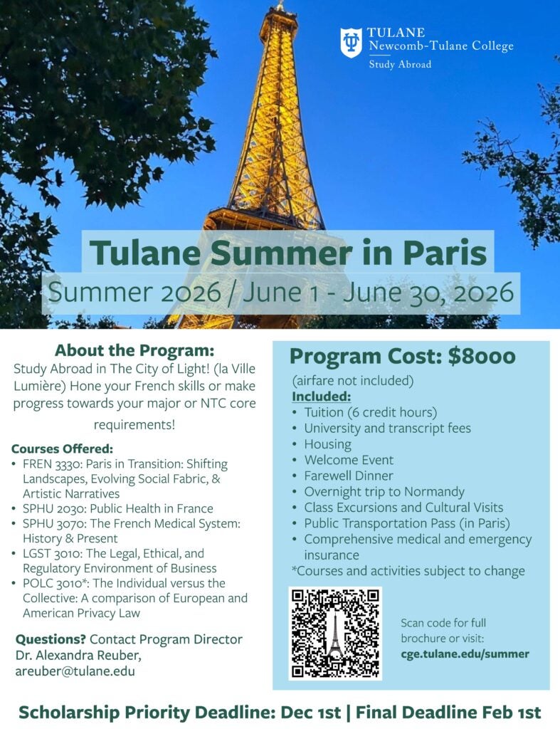 If you are thinking about studying abroad this summer, please consider the Summer in Paris program. During this month-long program (June 1-30), students take six credits taught by Tulane faculty. All courses are offered in English, so no knowledge of French is needed. Classes are based on excursions and guest speakers, so students get a lot of experience outside the traditional classroom.