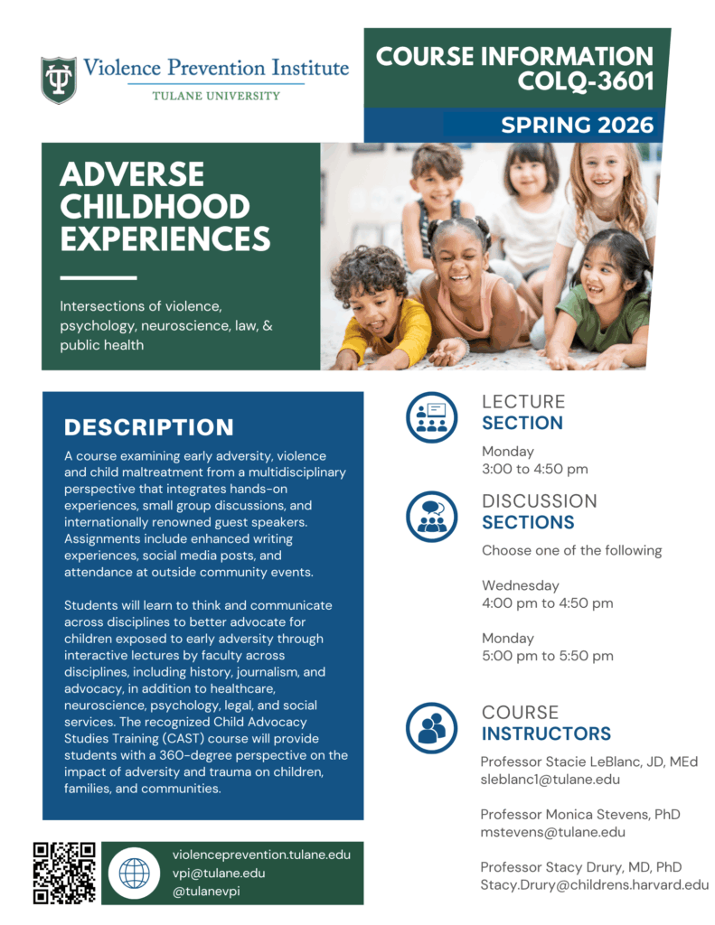 This course takes a unique 360 perspective on early adversity, violence, and child maltreatment. Through integrating hands on experiences, small group discussions, internationally renowned guest speakers, community engagement and writing and social media assignments students are expected to increase their ability to think across disciplines, specifically neuroscience, public health, law, public policy and psychology.