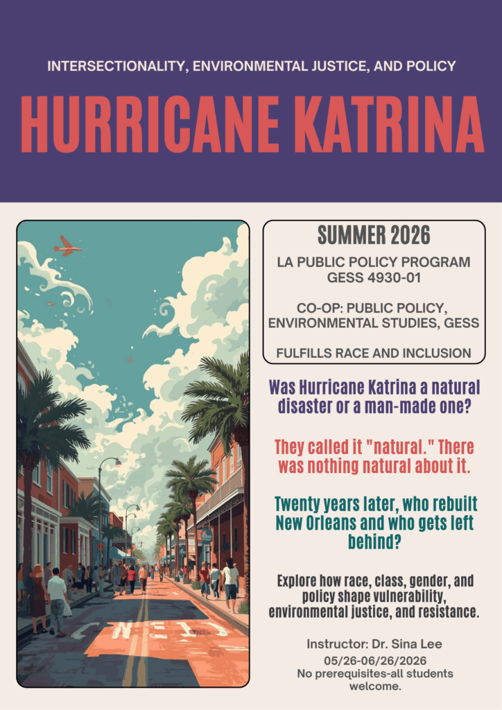 This summer course examines how race, class, gender, disability, and public policy shaped who survived Katrina, who could evacuate, and who was able to return home. We’ll explore environmental racism, disaster capitalism, housing discrimination, public health disparities, and grassroots resistance — all through the lived histories and untold stories of New Orleans.